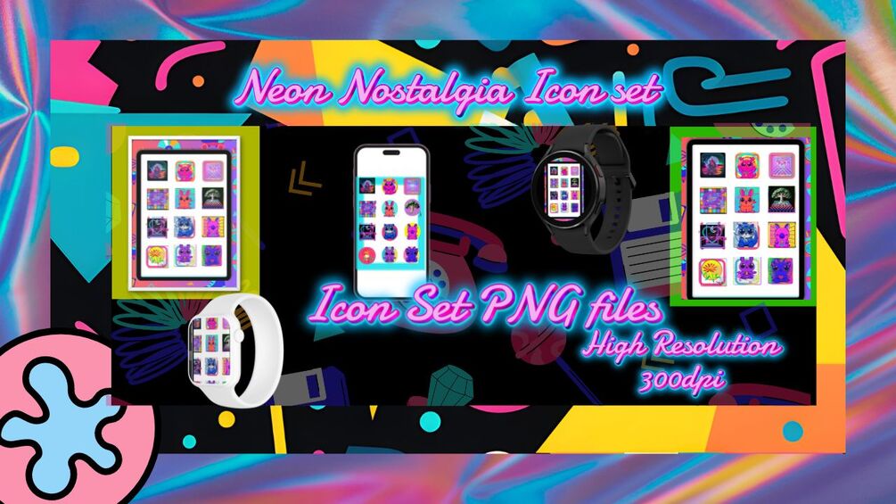 Description for Gumroad Listing: Dive into the vibrant world of “Neon Nostalgia,” an exclusive collection of digital icons that bring a touch of retro-futurism to your digital space. Each icon is crafted with radiant neon hues and nostalgic motifs, perfect for personalizing your gadgets or social media. This collection features a variety of designs, including landscapes, animals, and abstract patterns, all glowing with neon colors and geometric shapes.